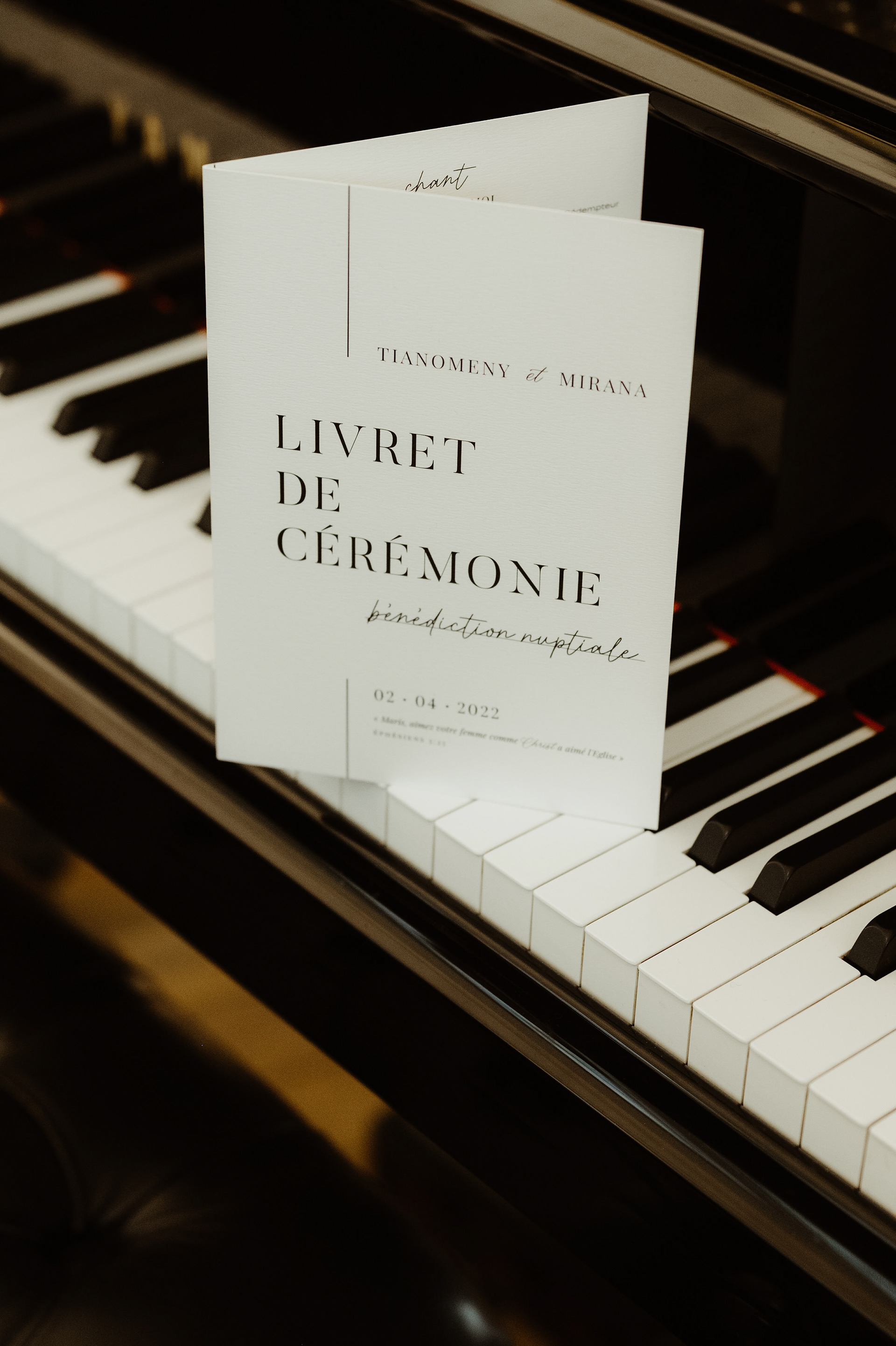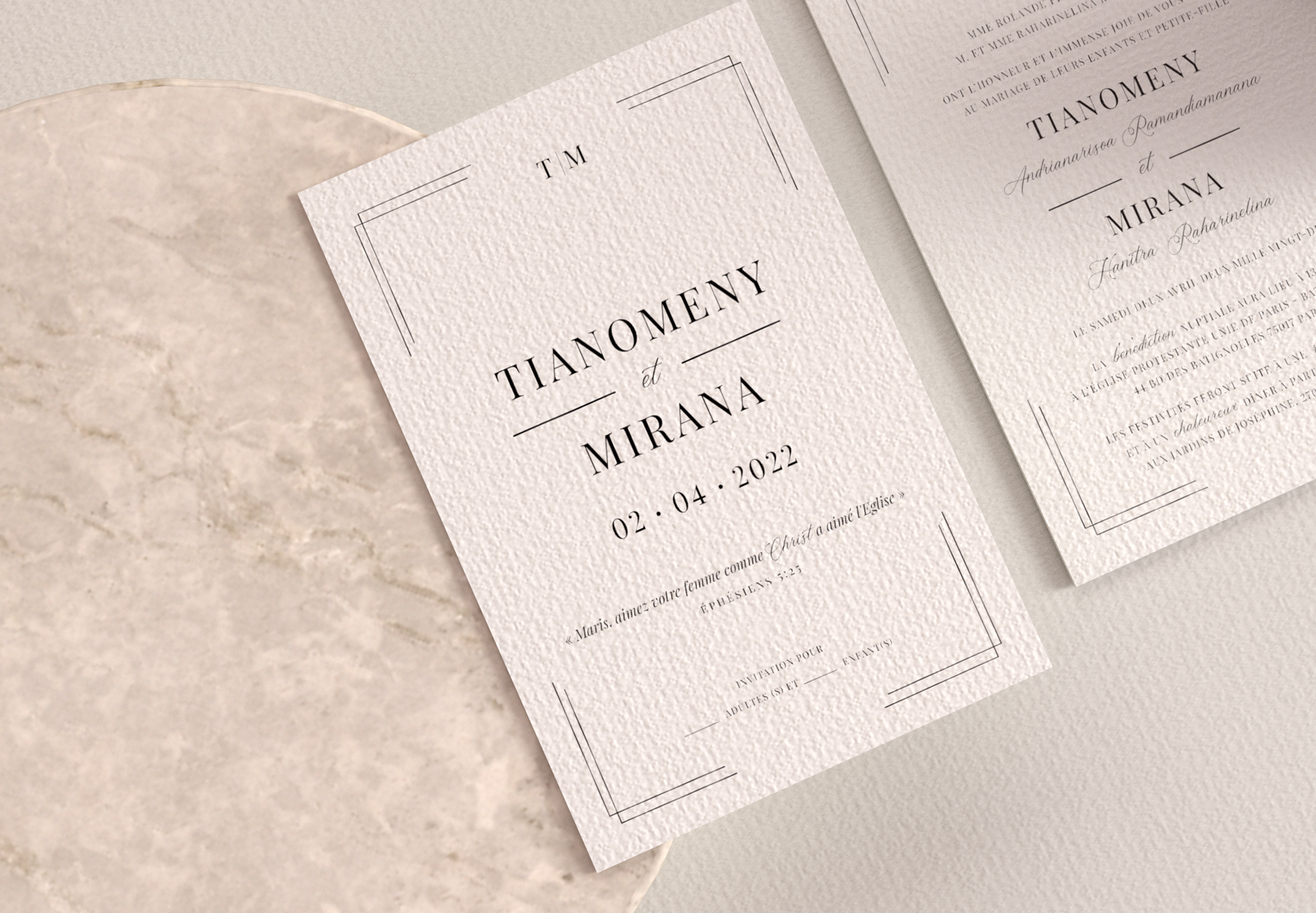 Chaque création — du faire-part aux menus — a été pensée comme un jeu de contrastes subtils, sublimés par un papier texturé Rives Tradition 320g, qui apporte relief et caractère 🖤🤍.